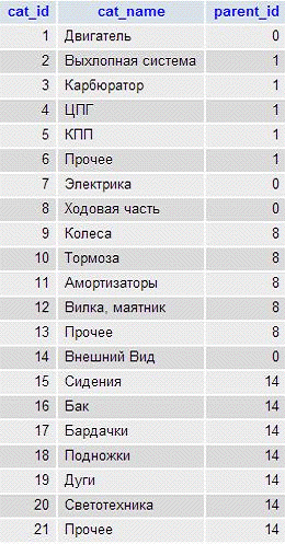 отсортированных по полям parent_id, cat_name.