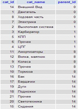 таблицы cat и сортировать эти данные сначала по полю parent_id,