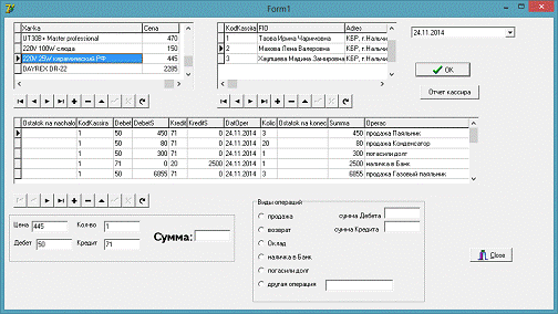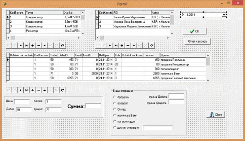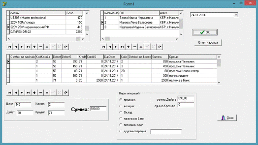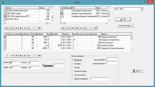 Edit4.Text;.GurOper1.FieldByName('DatOper').AsString:=DateToStr(DateTimePicker1.Date);.GurOper1.FieldByName('KodKassira').AsString:=Ligidov.Kassir.FieldByName('KodKassira').AsString;.GurOper1.FieldByName('Kolic').AsString:=Edit2.Text;:=CalKuljator(Edit1.Text,Edit2.Text,'*',2);:=ZnakZamena(a0,'.',',');.GurOper1.FieldByName('summa').AsString:=a0;.Text:=a0;radiobutton1.Checked