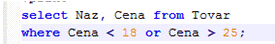 Tovar,SkladInN2 and 5;Naz, Cena, Kol_vo from Tovar,SkladNaz like 'Tetr%';Naz,