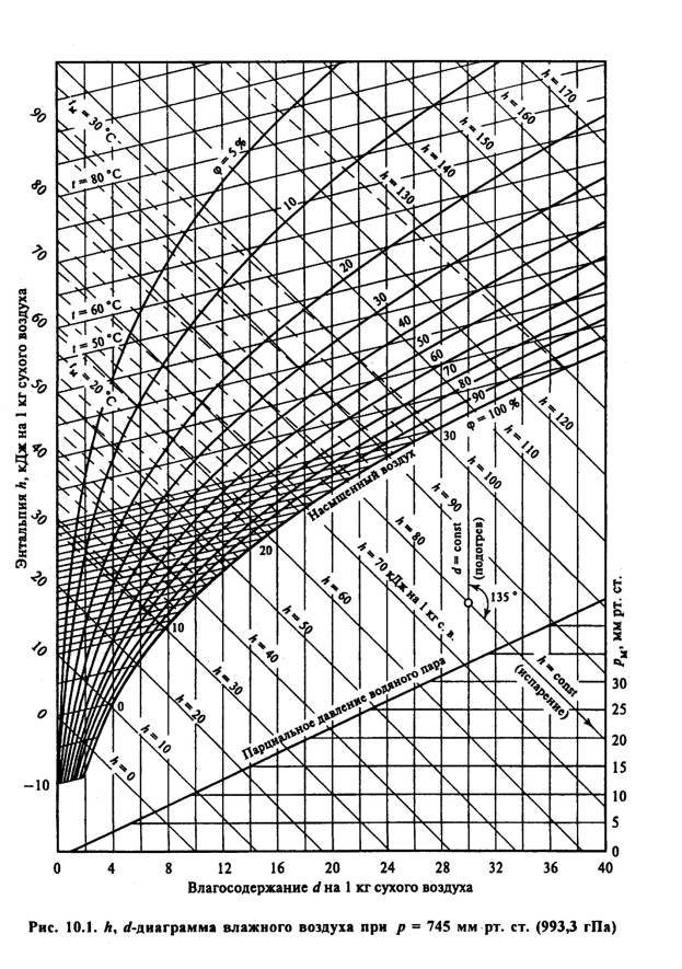 греющего теплоносителя, температура и влажность сушильного воздуха в разных