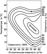 смертности куколок яблоневой плодожорки от двух факторов - температуры и