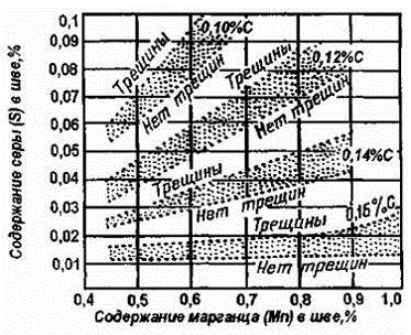 трещин в швах от содержания S,