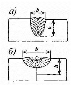 - рис. 6, а) более склонны к горячим трещинам, чем швы с отношением b/h