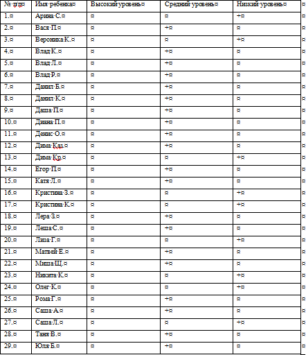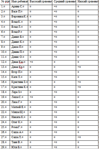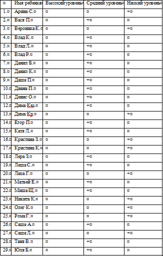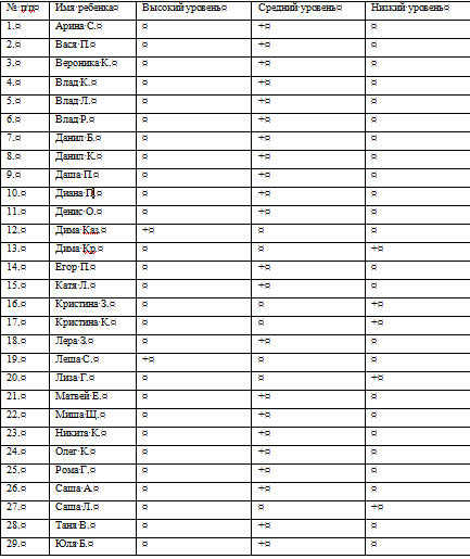 п/пИмя ребенкаВысокий уровеньСредний уровеньНизкий уровень