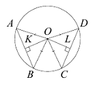проведены две равные хорды АВ и СО. На эти хорды опущены перпендикуляры ОК и OL