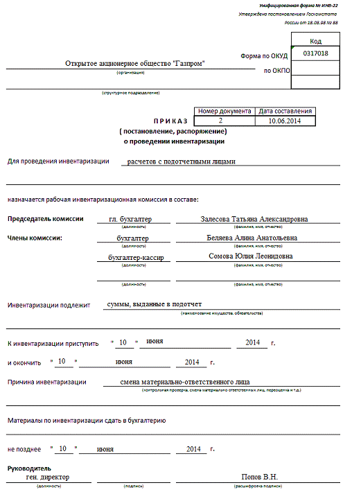 генеральным директором с главным бухгалтером. Графики проведения инвентаризации