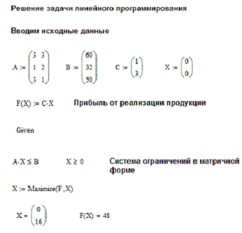Mathcad 13. Левые части ограничений системы (1) введем в матрицу А, а правые -
