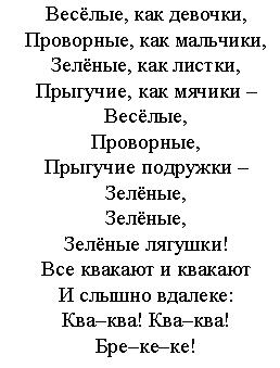 Лягушка четко и громко командует, один лягушонок прыгает, а остальные