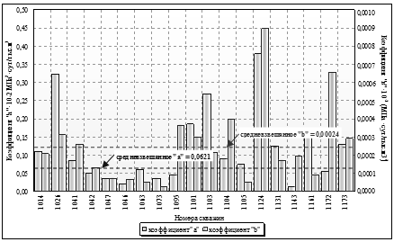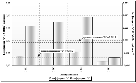 сут/тыс.м3(скважина №1301); "b" от 0,00063·10-2 (МПа сут/тыс.м3)2