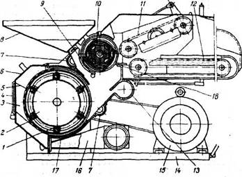 дробарка обладнана барабаном 12, живильним 14 і пресуючим 17 транспортерами.