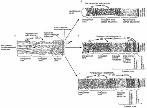 Дифференцировка стенок нервной трубки. А. Схематическое