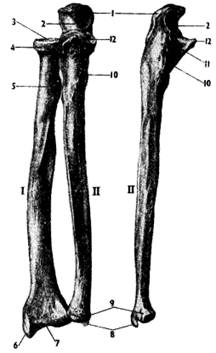 (I) и локтевая (II) кости в положении супинации Б; (II) - правая локтевая кость