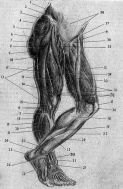 большеберцовая мышца; 23 - задние глубокие мышцы голени; 24 - внутренняя