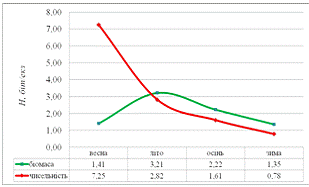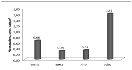 Середні значення біомаси були такими: 1,22±0,27 г/м3, чисельності -