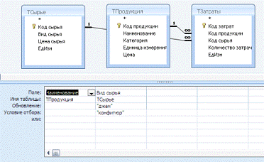 Запросов. В окне Добавление таблиц выбрать ТЗатраты, ТСырье, ТПродукция.