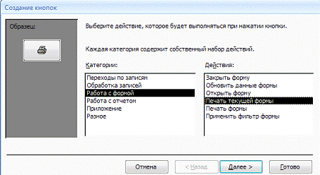 на форму. Открывается окно «Создание кнопок», в категории выбираем «Работа с