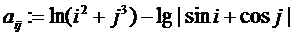 to 5 doj:=1 to 5 do[i,j]:=ln (i*i+j*j*j)-ln(abs(sin(i)+cos(i)))/ln(10);;