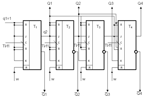 Для формирования сигналов q1, q2 ,q3, q4 использую встроенную логику ЗИ JK- триггеров. В результате память КА,