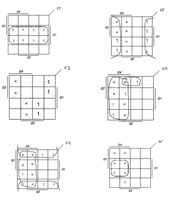 устройство КУ2, имея на своих входах сигналы Q1, Q2, Q3, Q4 должно формировать выходные сигналы V1, V2,…V7, W согласно таблице 3. Формулы для МДНФ выходных