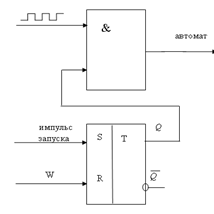"И". Когда вырабатывается команда СТОП, на вход R триггера подается сигнал W=1, на выходе Q появляется 0, и схема "И"