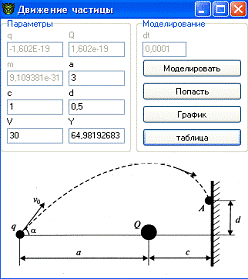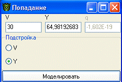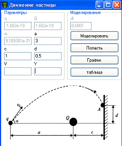 соотношения величины начальной скорости V0 движущейся частицы q и угла прицеливания α, чтобы она попала в мишень. Так же необходимо учитывать, что