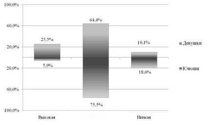 на три группы респондентов с низким, средним и высоким уровнем социального