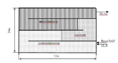 Схема состояла из первичного горизонтального отстойника, денитрификатора,