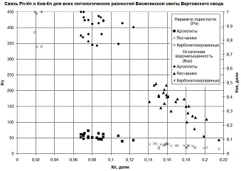 и остаточной водонасыщенностью (Ков) и Кп для трех