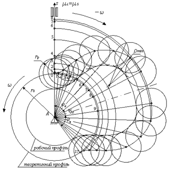профілю кулачка з різних точок теоретичного профілю кулачка проводимо дуги кола