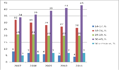 Состав осужденных по возрасту, %