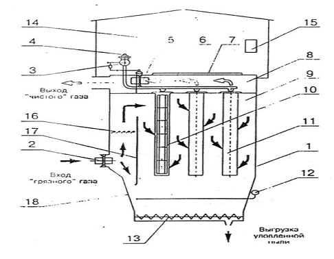 відбійним щитом і стінкою бункера. «брудний» газ, пройшовши рукави ззовні-всередину,