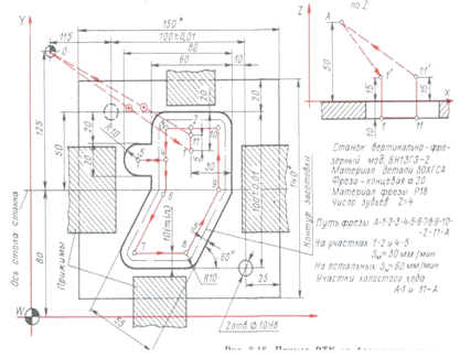 состоит из следующих частей: унастка ввода фрезы в зону резания (1-2),