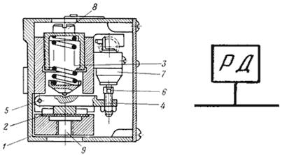 Принципиальная схема (а) и условное обозначение (б) реле давления