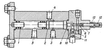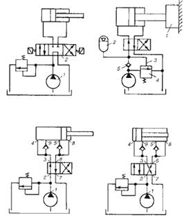 положении распределителя 1 поршень гидроцилиндра движется вправо, совершая