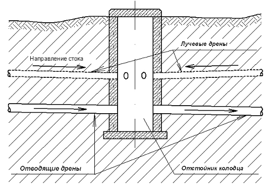 лоток дрены был выше дна колодца на 0,5 м. 0.5 м - это высота отстойника в