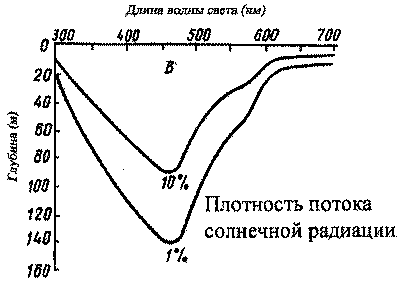 В океанах, где вода очень прозрачна, на глубину 140 м проникает 1%