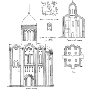 Рис. 22 План, фасад и детали декора церкви Покрова на Нерли
