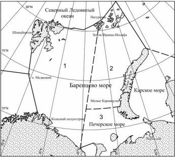 морями, на востоке - с Карским морем и на юге - с побережьем Кольского