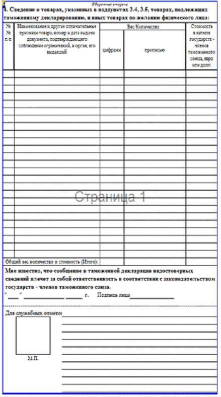 Форма пассажирской таможенной декларации