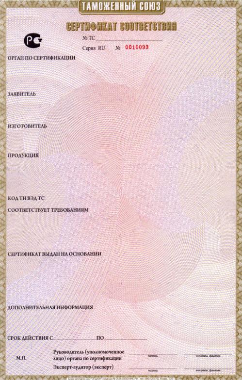 ФОРМА СЕРТИФИКАТА СООТВЕТСТВИЯ ТАМОЖЕННОГО СОЮЗА