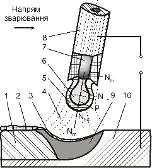 электродом 8 и основным металлом 10. Под действием теплоты дуги электрод и