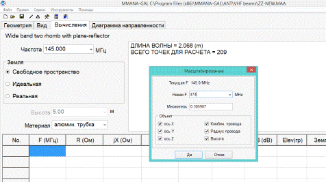 на требуемой частоте ещё раз масштабируем антенну и получим: