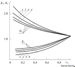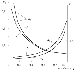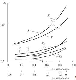 молярная доля компонента в паровой фазе, а также коэффициент разделения