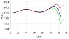 магнитного поля вдоль оси в рабочей области преобразователя при минимальных его
