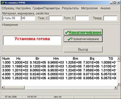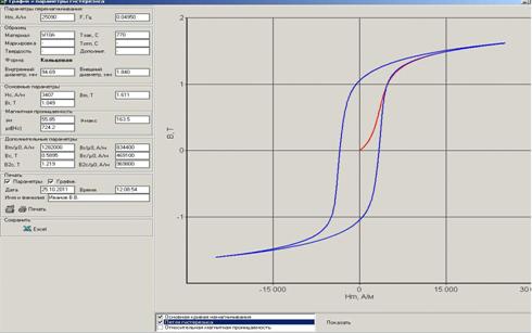 магнитные параметры ферромагнитного образца. Кроме того, выводятся дата и время