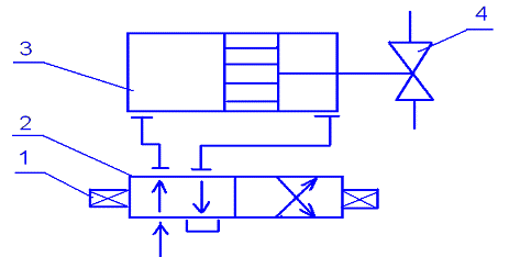 1-электромагнит, 2-золотник, 3-сервомотор, 4-клапан