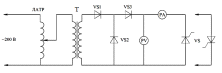 тиристоров. Ручку потенциометра поверните вправо до упора (ток управления равен