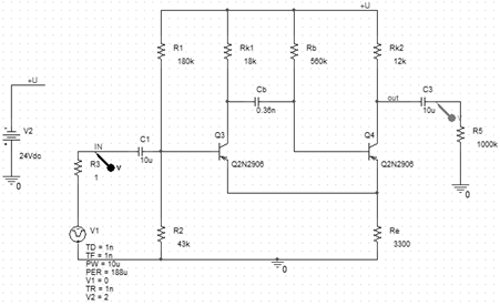 поступає на вихід через витоковий повторювач, зібраний на транзисторі VT2. Його