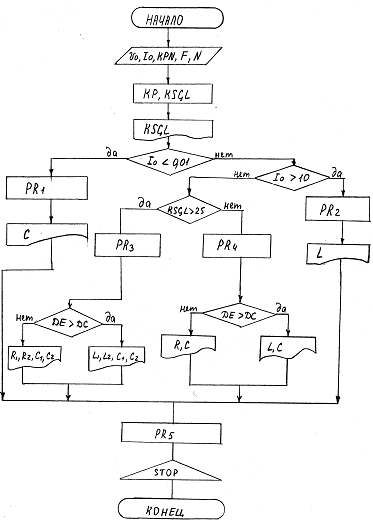 подпрограмма вычисления параметров двузвенных LC и RC фильтров;